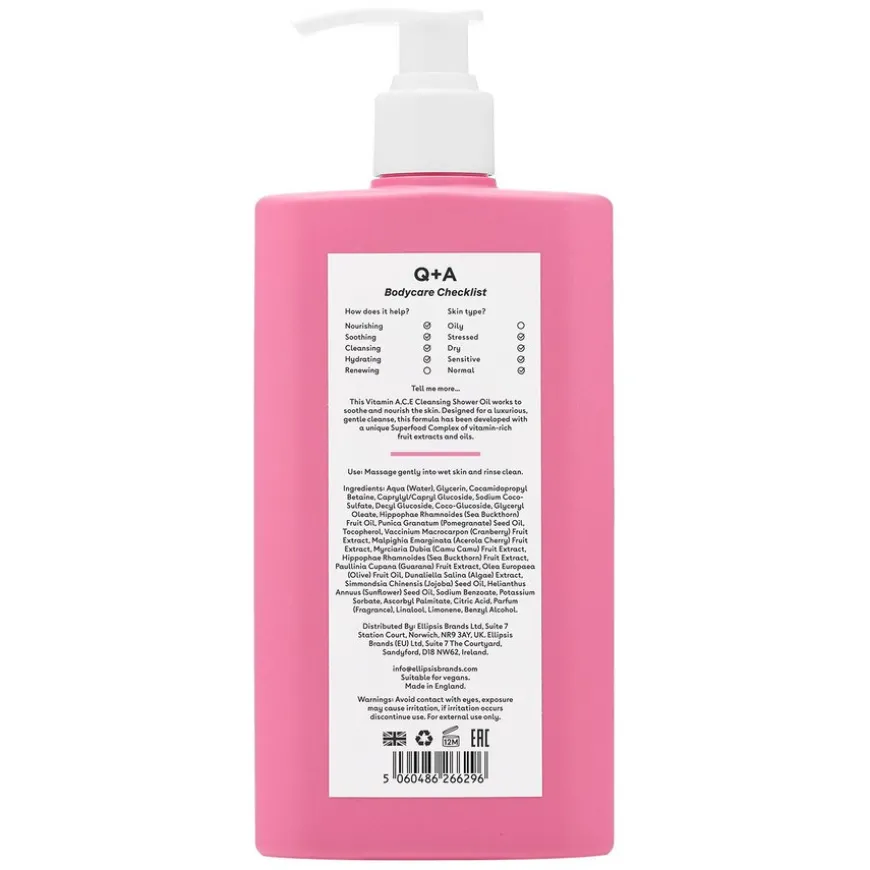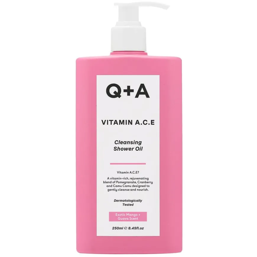 Vitamin A.C.E Cleansing Shower Oil en dusjolje med superfood-ingredienser som beroliger og gir næring til huden. Formulert med vitaminrike fruktekstrakter og oljer fra granateple, tranebær og camu camu, sammen med betakarotener som gir huden en dypt nærende rens og strålende glød. Dusjoljen har en deilig duft av mango og guava, og er formulert med overflateaktive stoffer som er milde mot huden.