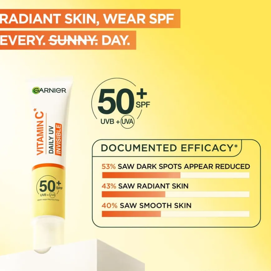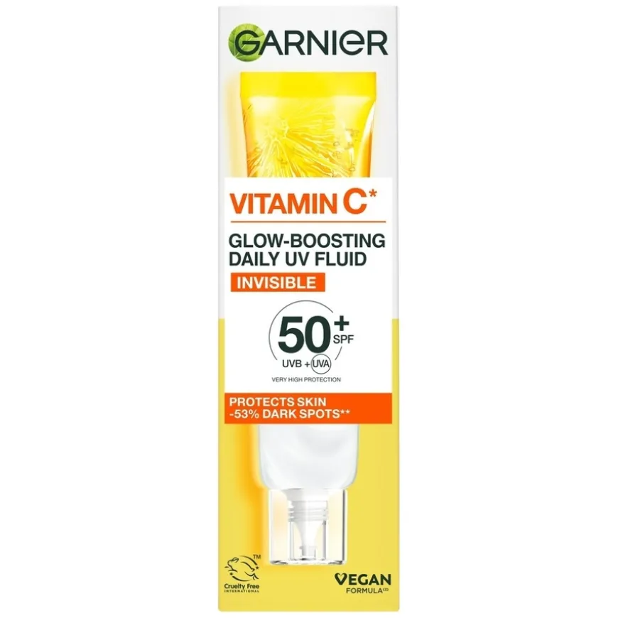 Vitamin C* Glow-Boosting Daily UV Fluid SPF50+ med usynlig finish for ansiktet og svært høy beskyttelse, SPF50+. Den lette, flytende formelen med c-vitamin*, peptider og hyaluronsyre fukter huden hele dagen, samtidig som den beskytter mot UVB-, UVA- og lange UVA-stråler for å forebygge pigmentflekker – uten å føles klissete eller fet.