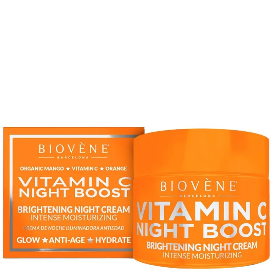 Vitamin C Night Boost Anti-Age Brightening Night Cream fukter huden over natten med vitamin C og organisk mango for optimal aldersstøtte for å umiddelbart fukte huden, hjelpe til med restitusjon og introdusere en vakker glød for neste dag. Vitamin C lysner opp hudtonen og reduserer forekomsten av aldringstegn.