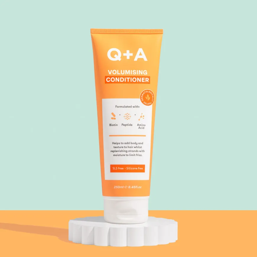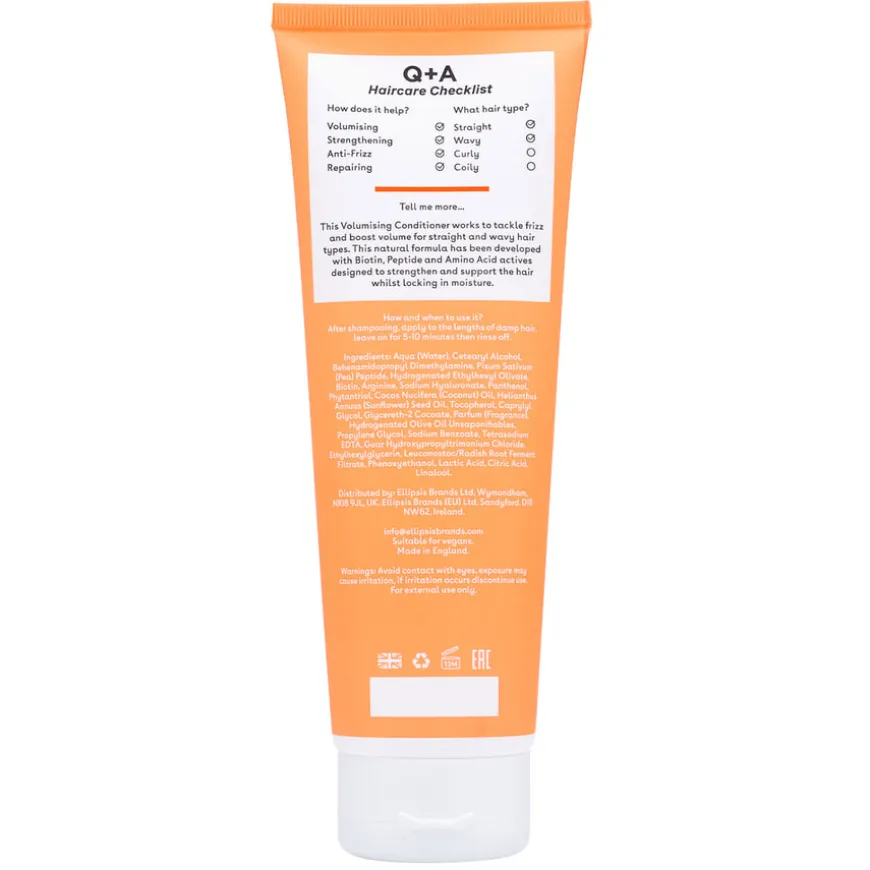 Volumising Conditioner fra Q+A er en volumgivende balsam som gir håret rikelig med fylde, fuktighet og glans. Formulert med biotin, peptider og aminosyrer for å gi håret økt volum, tekstur, i tillegg til å styrke hårstrukturen. Hyaluronsyre er også inkludert for å støtte håret samtidig som den låser inn fuktighet til hodebunnen. Peptider og aminosyre har reparerende egenskaper som gjør håret mer motstandskraftig og roer ned frizz. Sammen med biotin blir håret sterkere med en sunnere og mykere tekstur og glans.