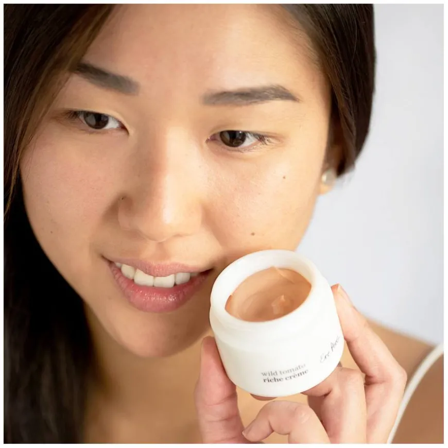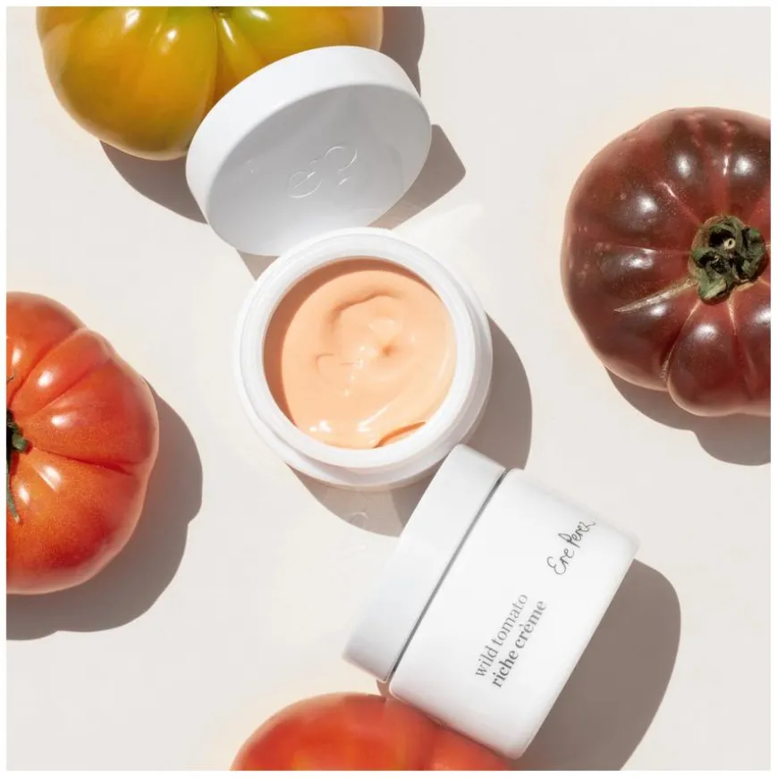 Wild Tomato Riche Crème er en reparerende villtomatkrem som passer både til dag og nattbruk for alle hudtyper, inkludert sensitiv hud. Den gjenoppretter hudens ungdommelige glød og forhindrer tap av fuktighet. Tomatfrøolje forbedrer hudens elastisitet og er en av de beste kildene til lykopen. Lykopen fukter tørre hudområder og mykgjør hudens overflatelag. Hyaluronsyre, kakaosmør og E-vitamin gir dyp næring til huden, mens lavendel og kamille beroliger sensitiv hud. Allantoin, hentet fra comfreyroten, fungerer som en beskyttende barriere mot ytre påvirkninger. Passer også for sensitiv hud! Bruk morgen og kveld som siste steg i hudpleierutinen.