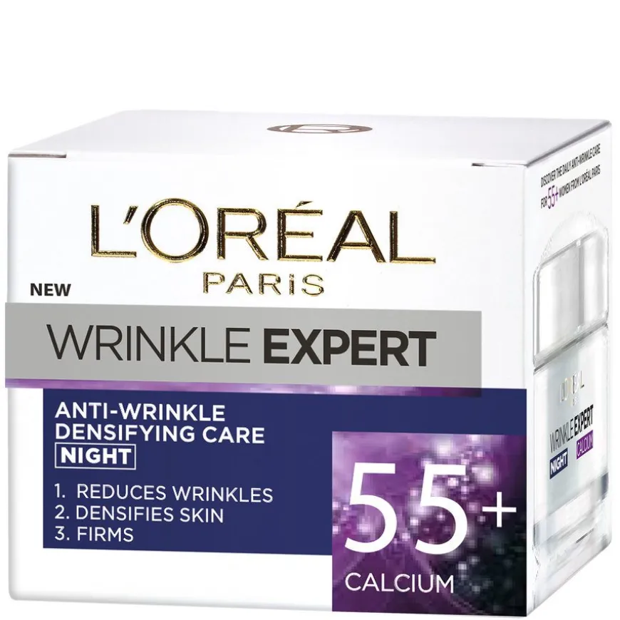 WrinkleExpert 55+ Night cream er en oppstrammende fuktighetsgivende antirynkenattkrem beriket med kalsium spesielt utviklet for moden hud (55år +). Fra 55-årsalderen begynner huden å miste en del av sin vitale næring og kan virke tørr og rynkete. Wrinkle Expert-serien ivaretar denne aldersgruppes spesifikke behov.